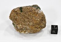 Коллекция Систематическая коллекция, №77127. Зеленые полупрозрачные изометричные кристаллы {110} размером до 0.4см в кавернозном зернистом кварцевом агрегате. Длина экспоната 6.0 см.Размер минерала 0.50 см.