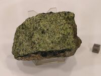 Коллекция Систематическая коллекция, №78661. Светло-зеленые полупрозрачные до прозрачных субизометричные зерна Fe-форстерита (до 0,5 см) с ярко-зелеными зернами Cr-диопсида, бутылочно-зеленым ортопироксеном и редкими красно-бурыми зернами хромшпинели в фрагменте ксенолита практически не измененных шпинелевых лерцолитов из щелочных базальтов. Сохранился небольшой фрагмент вмещающих пород. 13х8х7