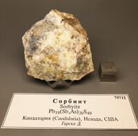 Найден: Candaldria, Mineral Co., Невада, США.Минералы-спутники: Пирит, Биндгеймит, Кварц. Расположен на витрине exp73-3