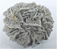 Коллекция Систематическая коллекция, №79833. Изометричный сросток пластинчатых кристаллов гипса серого цвета за счет захваченных при росте включений глины. Размер сростка около 16см. Длина экспоната 16.0 см.