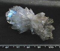 Коллекция Систематическая коллекция, №81654. Сноповидный сросток (6,5см) расщепленных кристаллов кварца. С эпидотом. Длина экспоната 6.5 см.Размер минерала 3.00 см.