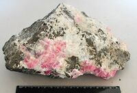 Коллекция Систематическая коллекция, №81799. Крупные (до 6см) обособления ярко-розового содалита в микроклиновом пегматите с герцинитом и аннитом. Длина экспоната 17.0 см.