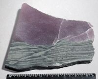 Коллекция Систематическая коллекция, №82355. Мелкозернистый агрегат фиолетового ангидрита с участком зеленой слоистой породы. Полированный образец. Размер образца 15х14х3см. Длина экспоната 15.0 см.