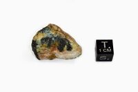 Коллекция Систематическая коллекция, №83163. Балякинит (зеленый и теллуриты Fe-Cu-Pb (лимонитоподобные) с включениями билибинскита в кварце. Длина экспоната 3 см.