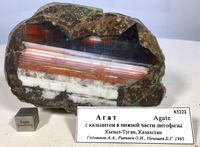 Найден: Кызыл-Туган, 10 км к северу от станции Айнабулак, Казахстан.Минералы-спутники: Кальцит. Расположен на витрине exp81b