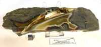 Коллекция Систематическая коллекция, №83250. Агат с псевдоморфозами халцедона по кальциту (следы спайности) и по папиршпату; 2 уровня в жеоде