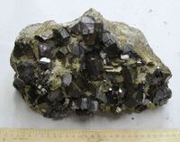 Коллекция Систематическая коллекция, №83330. Друза пинакоидально-призматических уплощенных кристаллов пирротина размером до 5х2см и кубоктаэдрических кристаллов галенита до 3см. С кварцем. Размер штуфа 27х16х8см. Длина экспоната 27.0 см.Размер минерала 5.00 см.