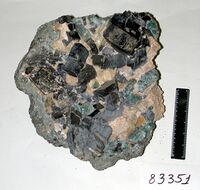 Коллекция Систематическая коллекция, №83351. Столбчатые кристаллы флогопита до 8см с фторапатитом в кальцитовом обособлении в диопсиде. Штуф размером 30х28см Длина экспоната 30 см.Размер минерала 8.00 см.