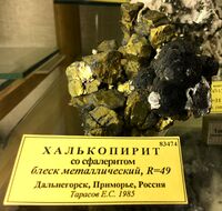 Найден: Дальнегорск (бывший Тетюхе), Приморье, Россия.Минералы-спутники: Халькопирит. Расположен на витрине exp122