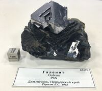 Найден: Дальнегорск (бывший Тетюхе), Приморье, Россия.Минералы-спутники: Сфалерит, Халькопирит. Расположен на витрине exp73-2