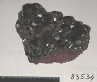 Коллекция Систематическая коллекция, №83534. Щетка темно-бурых изометричных ромбододекаэдрического габитуса с гранями тетрагонтриоктаэдра кристаллов андрадита размером до 5см. на мелкозернистом агрегате андрадита. Длина экспоната 20 см.Размер минерала 5.00 см.