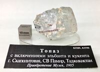 Найден: гора Скаполитова, 30 км от кишлака Рангкуль, восточный Памир, Таджикистан.Минералы-спутники: Топаз. Расположен на витрине exp12