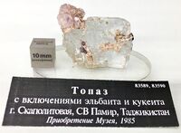 Найден: гора Скаполитова, 30 км от кишлака Рангкуль, восточный Памир, Таджикистан.Минералы-спутники: Рубеллит, Топаз, Лепидолит. Расположен на витрине exp12