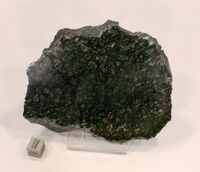 Коллекция Систематическая коллекция, №84004. Округлые (до 0,5 см) ярко-малиновые зерна пиропа с мелкими ярко-зелеными зернами пироксена в ксенолите интенсивно серпентинизированных гранатовых перидотитов со структурой течения, из кимберлитов. Фрагмент ксенолита, полированный срез. Местами по периметру заметная реакционная зона (~1 см).