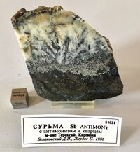 Найден: штольня 59, зона Перевальная, Терексай, 70 км к северо-западу от Намангана, Киргизия.Минералы-спутники: Антимонит, Кварц. Расположен на витрине exp13