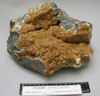 Коллекция Систематическая коллекция, №84313. Корка оранжевых сферокристаллов размером до 0.5см. на магнетитовом скарне с пиритом. Размер образца 22х16 см. Длина экспоната 22.0 см.