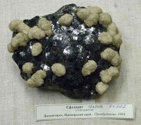 Коллекция Систематическая коллекция, №84321. Друза кристаллов марматита (размером до 1см) с кальцитом. Размер штуфа 14х11х6см. Длина экспоната 14.0 см.Размер минерала 1.00 см.
