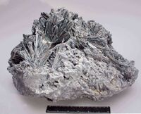 Коллекция Систематическая коллекция, №84341. Пучки игольчатых кристаллов длинной до 10см, местами покрытые халцедоном, на ороговикованном углисто-кремнистом сланце. Размер образца 30х40 см. Длина экспоната 40 см.