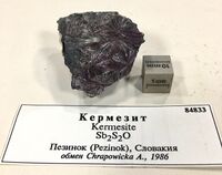 Коллекция Систематическая коллекция, №84833. Ярко-вишневые 10-17 мм сферолиты в плоск. трещины в рассланцев. антимонит. руде. 4-5 см.