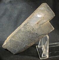 Коллекция Систематическая коллекция, №84886. Серовато-белый пинакоидально-призматический кристалл {001} + {100} + {011} + {101} с присыпкой мелких кристаллов пирита. Размер 13х4.5 см Длина экспоната 13.0 см.Размер минерала 13.00 см.