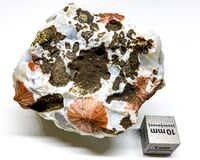 Коллекция Систематическая коллекция, №84901. 4-15 мм красные сферолиты, пластинч. агрегаты Са-клиноптилолита в халцедоновой миндалине, дакиардит. 5х5 см