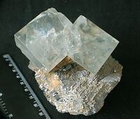 Коллекция Систематическая коллекция, №85072. Два светло-зеленых прозрачных субпараллельно сросшихся кубических кристалла размером 4см по ребру на галените. Размер 9х6 см. Длина экспоната 9.0 см.Размер минерала 4.00 см.