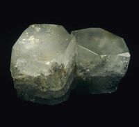 Коллекция Систематическая коллекция, №85167. Сросток 2-х (3.7; 3.5 см) полупрозрачных кристаллов мурзинского типа с вростками 3-4 мм чешуек белого лепидолита.