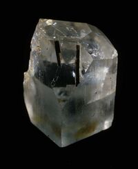 Коллекция Систематическая коллекция, №85169. 3.3х2.3х1.6 см бледно-голубой прозрачный кристалл необычного габитуса (7 форм) с включен. игольчатого шерла.