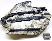 Коллекция Систематическая коллекция, №85191. 4-10 см фрагменты разноориентированных плоскопризматических ступенчатых кристаллов в крупнозернистом натролите с мелкими кристаллами натролита и "Zr-галлуазитом" в пустотах. 12х8х4 см.
