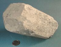 Коллекция Систематическая коллекция, №85284. Бледно-зеленый столбчатый призматический кристалл размером 15,5х7х6см. Огранен габитусными: призмой {100} и дипирамидой {111} с подчиненным развитием форм {110} и {101}. Кристалл сильно поврежден. Длина экспоната 15.5 см.Размер минерала 15.50 см.