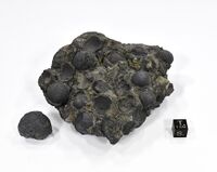 Коллекция Систематическая коллекция, №85295. Пизолиты магнетита до 2см, сцементированные хлорит-магнетитовой породой. Размер образца 10.5х8.5х4.5 см. Длина экспоната 10.5 см.