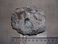 Коллекция Систематическая коллекция, №85444. 2-3 см прозрачное зерно и зеленовато-голубой ковдорскит (псевдоморфоза по неизвестному минералу) в зернистом доломите. 7х6.5х2.5 см.