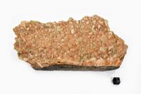 Это образец стильбита с хребта Сайлюгем в Горном Алтае. Более крупные розовые кристаллы образовались раньше, мелкие почти белые выделения — более поздние. Стильбит получил название по яркому блеску его кристаллов от греческого «stilbe» — зеркало, блеск. Минерал относится к группе цеолитов класса алюмосиликатов. Это минералы с интересной кристаллической структурой, которая представляет собой каркас с большими полостями, что позволяет использовать это минералы, например, как молекулярные фильтры.
