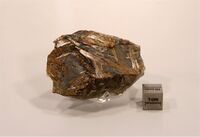 Коллекция Систематическая коллекция, №85589. Красновато-желтый - сетка тонкопризматических кристаллов по пластинам ильменита (сагенит) и пучки игольчатых кристаллов в дымчатом кварце. 6.5х4х2.5 см. Длина экспоната 6.5 см.