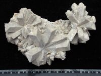 Коллекция Систематическая коллекция, №85632. Группа серых за счет захваченных при росте частиц известковистого песчаника радиальных сростков призматических кристаллов целестина до 4см. Размер образца 12х8х6 см. Длина экспоната 12.0 см.