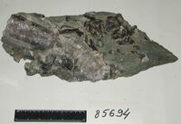Коллекция Систематическая коллекция, №85694. Зональноокрашенные темно-коричневые до светло-коричневых двойниковые по (100) кристаллы 1-4 см на плоскости разрыва слюдистого сланца с кристаллами бесцветного кварца, кальцитом и железистым клинохлором. 39х17х14 см. Длина экспоната 39.0 см.