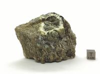 Коллекция Систематическая коллекция, №85946. Зеленоватый опаловидный и белый волокнистый в 0.4-1.4 см оторочке замещения кристаллов нефелина в массе волокнистого пектолита с биотитом. 7х6х6 см.