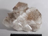 Коллекция Систематическая коллекция, №86024. Светло-дымчатый полупрозрачный до позрачного сросток отдельных групп блочных кристаллов с центральным 17 см скрученным вправо сростком кристаллов с "белой полосой". 21х12х13 см. Длина экспоната 21.0 см.