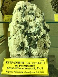 Найден: Cavnic, Румыния.Минералы-спутники: Пирит, Родохрозит, Кальцит, Пирит, Галенит. Расположен на витрине exp122