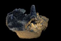 Коллекция Систематическая коллекция, №86228. Псевдосталагмит 4.5 см (от матрикса), покрыт снаружи коркой разноразмерных темно-зеленых xls укрупняющихся к основанию, с темно-синим землистым вивианитом в ядре, расщепл. xls и ядросферолиты на штуфе. 9.5х6.5х7.5 см.