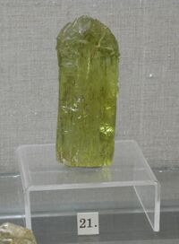 Коллекция Систематическая коллекция, №86288. Xl с неравномерно развитыми гранями призмы, ограниченный неравномернопирамидальной головкой и пинакоидом с дополнительными гранями дипирамиды, возникшими в результате растворения, зеленоватого цвета с мелкими фигурами растворения на гранях. 8х4.6х2.6 см.