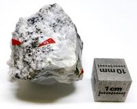 Коллекция Систематическая коллекция, №86315. Темно-зеленые 1-2 мм чешуйчатые агрегаты в зернистом доломите, с франклинитом, сфалеритом. Размер образца 3.5х3х2.3 см. Длина экспоната 3.5 см.