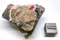Коллекция Систематическая коллекция, №86346. Розовато-коричневый сплошной с зернами алабандина, прожилками родохрозита в зернистой массе родонита, тинценит. 4.5х3.5х2.5 см.