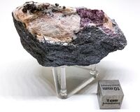 Коллекция Систематическая коллекция, №86368. Лиловые xls (фрагменты) с микроклином, "манганофиллитом", мелкие xls браунита и голландита на массивном зернистом брауните. 6.5х3.5х3.5 см.