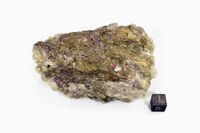 Коллекция Систематическая коллекция, №86405. Белые мелкопластинч. корочки замещения xls эвдиалита в сланцеватой массе волокнистого астрофиллита ни крупнозернистом микроклине. 9Х5.5х5 см.