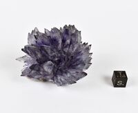 Коллекция Систематическая коллекция, №86499. Фрагмент радиально-лучистого сиреневого зонального сростка копьевидных, псевдопирамидальных, 1-3 см расщепл. xls. 6х5х3.5 см.