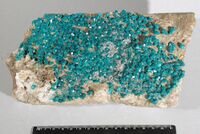 Коллекция Систематическая коллекция, №86501. Друзовая корка изумрудно-зеленых кристаллов 0.1х0.5см с хорошо развитыми гранями призмы {1120} и ромбоэдра {02-21} на кремово-сером известняке. 20х12х5.5см. Длина экспоната 20 см.