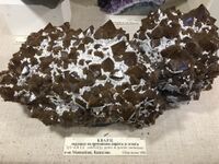 Коллекция Систематическая коллекция, №86509. Щетка шоколадно-бурых 2-3см пирамидального облика кристаллов (окраска от включений игл гетита) покрытых фрагментарно коркой белых мелких кристаллов гипса, на сферолитовой корке гетита. Размер 38х19х17см. Длина экспоната 38.0 см.