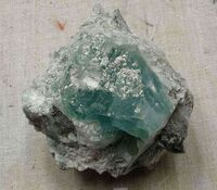 Коллекция Систематическая коллекция, №86526. Зеленовато-голубой полупрозрачный кристалл размером 8см с индукционными и интенсивно растворенными гранями на агрегате измененного серпентина с бруситом. Размер штуфа 14х13х13см. Длина экспоната 14.0 см.Размер минерала 8.00 см.