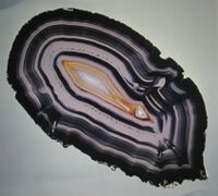 Коллекция Систематическая коллекция, №86622. Зонально-концентрический халцедоновый агат с черными и светло-серыми, а в центре красновато-бурыми зонами и рядом каналов; в широкой серой зоне - концентрическая цепочка черных "бляшек". Тонкий срез уплощенной миндалины со следами пережимов и небольшими кавернами от выщел. сферолитов (карбонатов(?) Размер пластины 23х12х0.5см. Длина экспоната 23.0 см.
